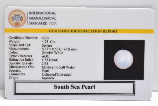 Beautiful 4.75 Cts South Sea Pearl (AAA+-Mines) sva 5+ Ratti SOUTH SEA PEARL. Free Horoscope & Free Pundit Ji Astrological Advise / Consultation. Original Natural Lab certified gems by IGI GTL / Birth stones / Large Gem Selection of shree shubh Rashi Ratan Vedic dhan at Gem Mines. May Bhagwan Brahma, Vishnu, Shiv & Universe bless you.