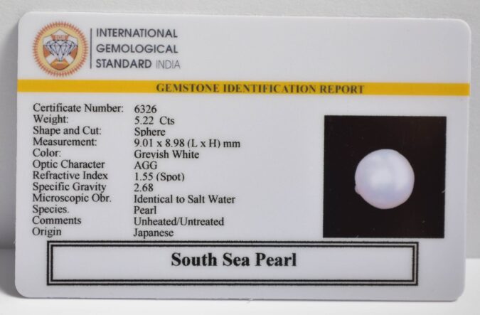 Beautiful 5.22 Cts South Sea Pearl (Top+-Mines) sva 5+ Ratti SOUTH SEA PEARL. Free Horoscope & Free Pundit Ji Astrological Advise / Consultation. Original Natural Lab certified gems by IGI GTL / Birth stones / Large Gem Selection of shree shubh Rashi Ratan Vedic dhan at Gem Mines. May Bhagwan Brahma, Vishnu, Shiv & Universe bless you.