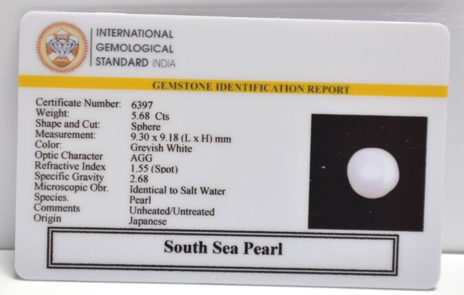 Certified South Sea Pearl 5.68 Ct.(6+ Ratti) in Sphere shape