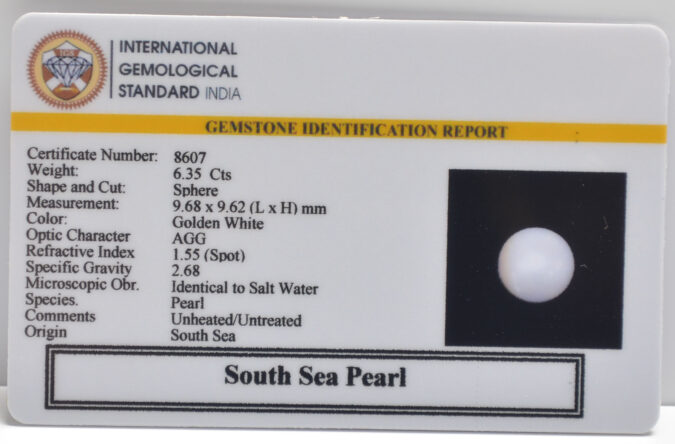 Beautiful 6.35 Cts South Sea Pearl (Good-Mines) sva 7+ Ratti SOUTH SEA PEARL. Free Horoscope & Free Pundit Ji Astrological Advise / Consultation. Original Natural Lab certified gems by IGI GTL / Birth stones / Large Gem Selection of shree shubh Rashi Ratan Vedic dhan at Gem Mines. May Bhagwan Brahma, Vishnu, Shiv & Universe bless you.