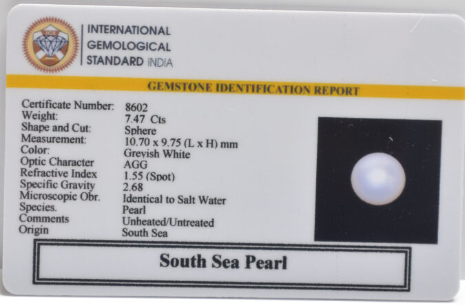 Beautiful 7.47 Cts South Sea Pearl (AAA-Mines) sva 8+ Ratti SOUTH SEA PEARL. Free Horoscope & Free Pundit Ji Astrological Advise / Consultation. Original Natural Lab certified gems by IGI GTL / Birth stones / Large Gem Selection of shree shubh Rashi Ratan Vedic dhan at Gem Mines. May Bhagwan Brahma, Vishnu, Shiv & Universe bless you.