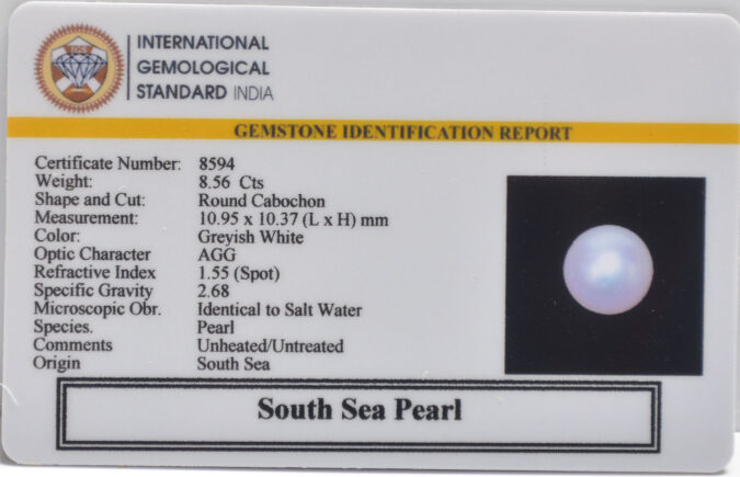 Beautiful 8.56 Cts South Sea Pearl (AAA-Mines) sva 9+ Ratti SOUTH SEA PEARL. Free Horoscope & Free Pundit Ji Astrological Advise / Consultation. Original Natural Lab certified gems by IGI GTL / Birth stones / Large Gem Selection of shree shubh Rashi Ratan Vedic dhan at Gem Mines. May Bhagwan Brahma, Vishnu, Shiv & Universe bless you.