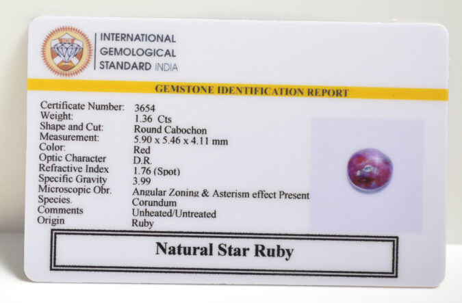 Beautiful 1.36 Cts Natural Star Ruby (AAA-Mines) sva 1+ Ratti STAR RUBY. Free Horoscope & Free Pundit Ji Astrological Advise / Consultation. Original Natural Lab certified gems by IGI GTL / Birth stones / Large Gem Selection of shree shubh Rashi Ratan Vedic dhan at Gem Mines. May Bhagwan Brahma, Vishnu, Shiv & Universe bless you.