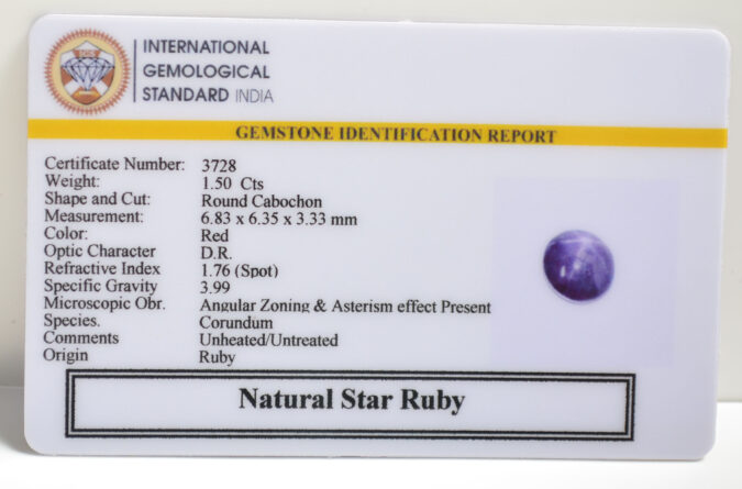 Beautiful 1.5 Cts Natural Star Ruby (AAA+-Mines) sva 1+ Ratti STAR RUBY. Free Horoscope & Free Pundit Ji Astrological Advise / Consultation. Original Natural Lab certified gems by IGI GTL / Birth stones / Large Gem Selection of shree shubh Rashi Ratan Vedic dhan at Gem Mines. May Bhagwan Brahma, Vishnu, Shiv & Universe bless you.