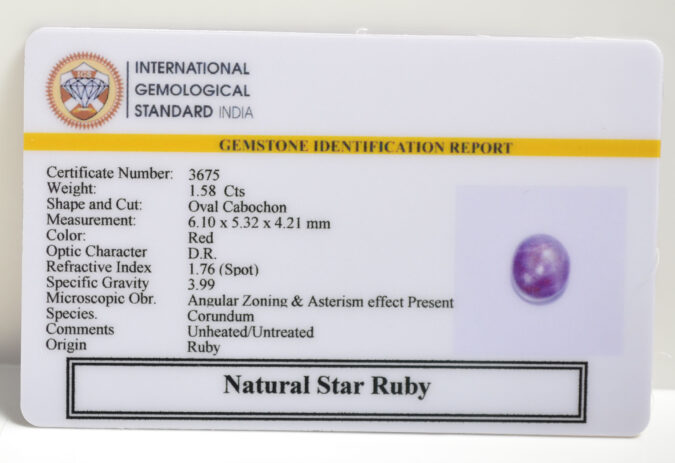 Beautiful 1.58 Cts Natural Star Ruby (AAA-Mines) sva 1+ Ratti STAR RUBY. Free Horoscope & Free Pundit Ji Astrological Advise / Consultation. Original Natural Lab certified gems by IGI GTL / Birth stones / Large Gem Selection of shree shubh Rashi Ratan Vedic dhan at Gem Mines. May Bhagwan Brahma, Vishnu, Shiv & Universe bless you.