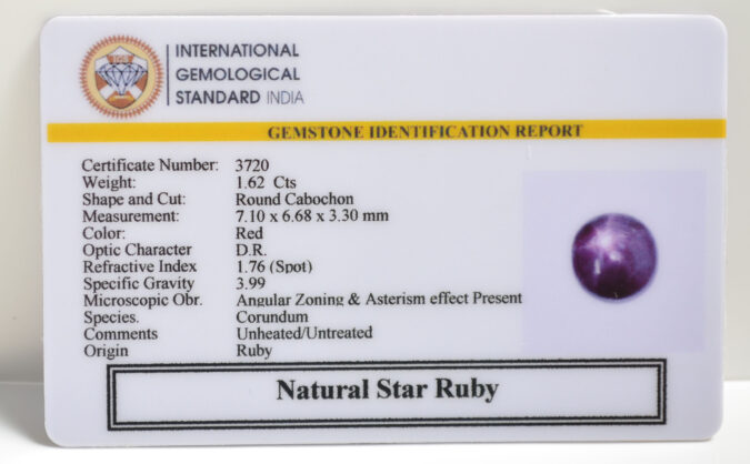 Beautiful 1.62 Cts Natural Star Ruby (AAA+-Mines) sva 1+ Ratti STAR RUBY. Free Horoscope & Free Pundit Ji Astrological Advise / Consultation. Original Natural Lab certified gems by IGI GTL / Birth stones / Large Gem Selection of shree shubh Rashi Ratan Vedic dhan at Gem Mines. May Bhagwan Brahma, Vishnu, Shiv & Universe bless you.