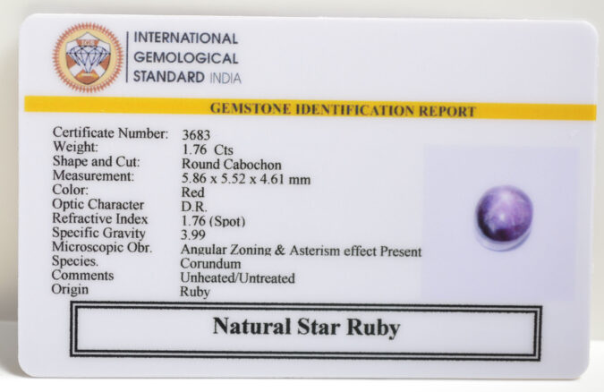 Beautiful 1.76 Cts Natural Star Ruby (AAA+-Mines) sva 1+ Ratti STAR RUBY. Free Horoscope & Free Pundit Ji Astrological Advise / Consultation. Original Natural Lab certified gems by IGI GTL / Birth stones / Large Gem Selection of shree shubh Rashi Ratan Vedic dhan at Gem Mines. May Bhagwan Brahma, Vishnu, Shiv & Universe bless you.