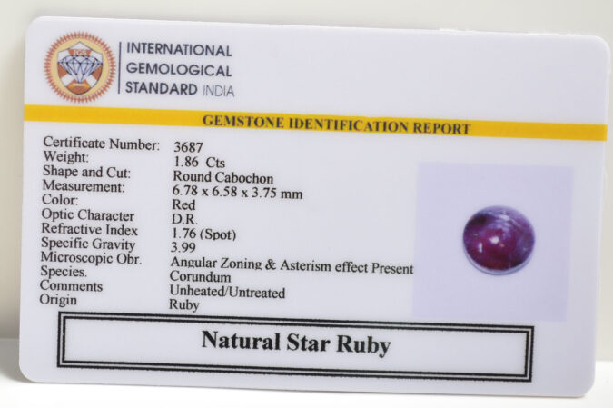 Beautiful 1.86 Cts Natural Star Ruby (AAA+-Mines) sva 2+ Ratti STAR RUBY. Free Horoscope & Free Pundit Ji Astrological Advise / Consultation. Original Natural Lab certified gems by IGI GTL / Birth stones / Large Gem Selection of shree shubh Rashi Ratan Vedic dhan at Gem Mines. May Bhagwan Brahma, Vishnu, Shiv & Universe bless you.