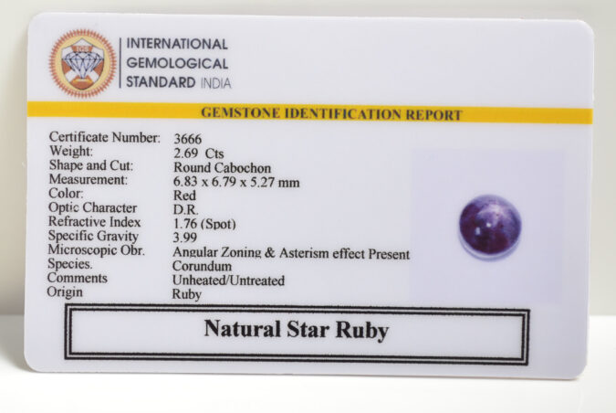 Beautiful 2.69 Cts Natural Star Ruby (AAA-Mines) sva 2+ Ratti STAR RUBY. Free Horoscope & Free Pundit Ji Astrological Advise / Consultation. Original Natural Lab certified gems by IGI GTL / Birth stones / Large Gem Selection of shree shubh Rashi Ratan Vedic dhan at Gem Mines. May Bhagwan Brahma, Vishnu, Shiv & Universe bless you.
