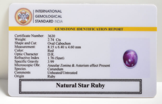 Beautiful 2.74 Cts Natural Star Ruby (Top-Mines) sva 3+ Ratti STAR RUBY. Free Horoscope & Free Pundit Ji Astrological Advise / Consultation. Original Natural Lab certified gems by IGI GTL / Birth stones / Large Gem Selection of shree shubh Rashi Ratan Vedic dhan at Gem Mines. May Bhagwan Brahma, Vishnu, Shiv & Universe bless you.