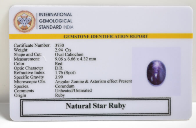 Beautiful 2.94 Cts Natural Star Ruby (AAA+-Mines) sva 3+ Ratti STAR RUBY. Free Horoscope & Free Pundit Ji Astrological Advise / Consultation. Original Natural Lab certified gems by IGI GTL / Birth stones / Large Gem Selection of shree shubh Rashi Ratan Vedic dhan at Gem Mines. May Bhagwan Brahma, Vishnu, Shiv & Universe bless you.
