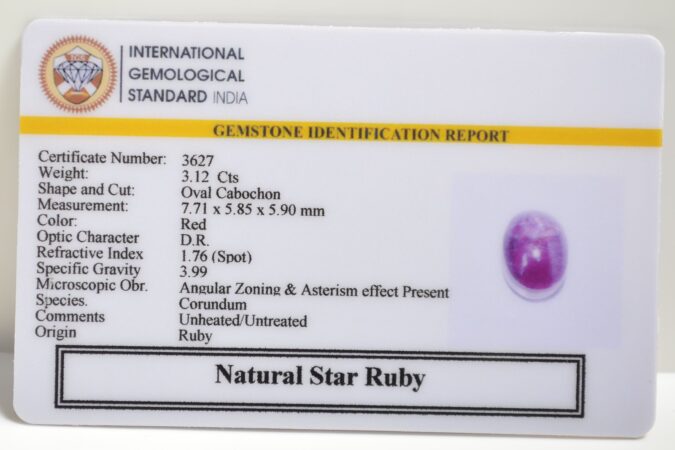 Beautiful 3.12 Cts Natural Star Ruby (Top-Mines) sva 3+ Ratti STAR RUBY. Free Horoscope & Free Pundit Ji Astrological Advise / Consultation. Original Natural Lab certified gems by IGI GTL / Birth stones / Large Gem Selection of shree shubh Rashi Ratan Vedic dhan at Gem Mines. May Bhagwan Brahma, Vishnu, Shiv & Universe bless you.