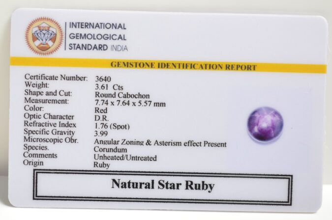 Beautiful 3.61 Cts Natural Star Ruby (Top-Mines) sva 4+ Ratti STAR RUBY. Free Horoscope & Free Pundit Ji Astrological Advise / Consultation. Original Natural Lab certified gems by IGI GTL / Birth stones / Large Gem Selection of shree shubh Rashi Ratan Vedic dhan at Gem Mines. May Bhagwan Brahma, Vishnu, Shiv & Universe bless you.