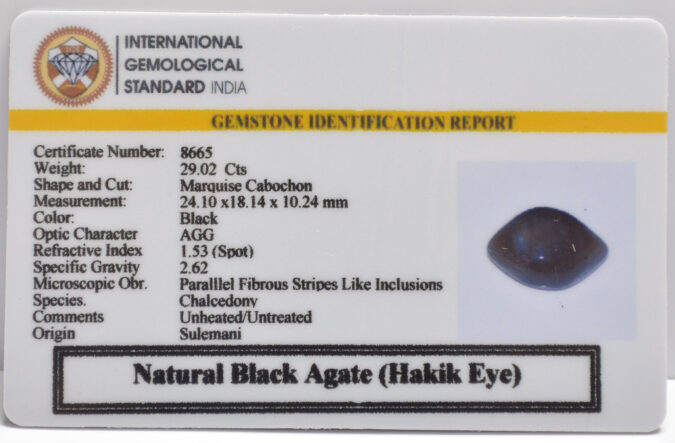 Beautiful 29.02 Cts Natural Black Agate (Hakik Eye) (Top-Mines) sva 32+ Ratti SULEMANI HAKIK. Free Horoscope & Free Pundit Ji Astrological Advise / Consultation. Original Natural Lab certified gems by IGI GTL / Birth stones / Large Gem Selection of shree shubh Rashi Ratan Vedic dhan at Gem Mines. May Bhagwan Brahma, Vishnu, Shiv & Universe bless you.