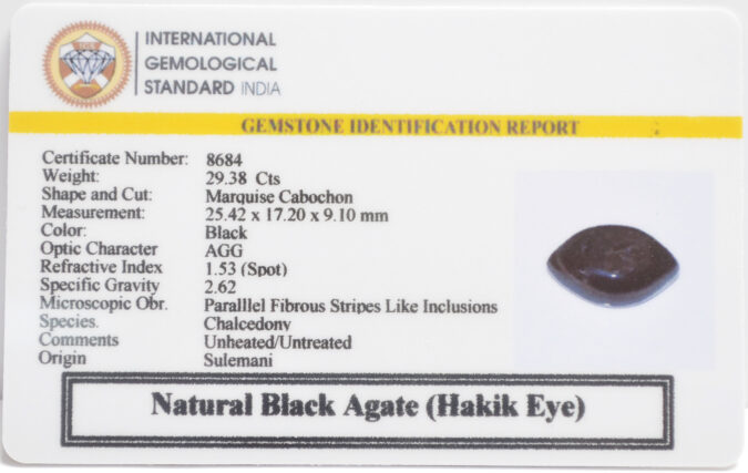 Beautiful 29.38 Cts Natural Black Agate (Hakik Eye) (AAA+-Mines) sva 32+ Ratti SULEMANI HAKIK. Free Horoscope & Free Pundit Ji Astrological Advise / Consultation. Original Natural Lab certified gems by IGI GTL / Birth stones / Large Gem Selection of shree shubh Rashi Ratan Vedic dhan at Gem Mines. May Bhagwan Brahma, Vishnu, Shiv & Universe bless you.