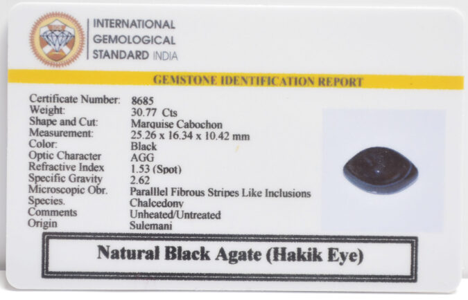 Beautiful 30.77 Cts Natural Black Agate (Hakik Eye) (AAA+-Mines) sva 34+ Ratti SULEMANI HAKIK. Free Horoscope & Free Pundit Ji Astrological Advise / Consultation. Original Natural Lab certified gems by IGI GTL / Birth stones / Large Gem Selection of shree shubh Rashi Ratan Vedic dhan at Gem Mines. May Bhagwan Brahma, Vishnu, Shiv & Universe bless you.