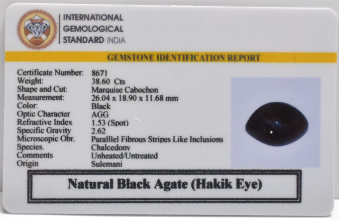 Beautiful 38.6 Cts Natural Black Agate (Hakik Eye) (Top-Mines) sva 42+ Ratti SULEMANI HAKIK. Free Horoscope & Free Pundit Ji Astrological Advise / Consultation. Original Natural Lab certified gems by IGI GTL / Birth stones / Large Gem Selection of shree shubh Rashi Ratan Vedic dhan at Gem Mines. May Bhagwan Brahma, Vishnu, Shiv & Universe bless you.
