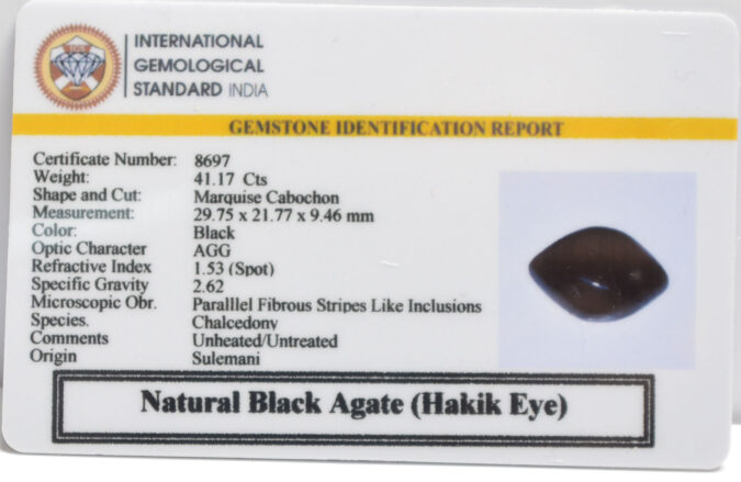 Beautiful 41.17 Cts Natural Black Agate (Hakik Eye) (AAA+-Mines) sva 45+ Ratti SULEMANI HAKIK. Free Horoscope & Free Pundit Ji Astrological Advise / Consultation. Original Natural Lab certified gems by IGI GTL / Birth stones / Large Gem Selection of shree shubh Rashi Ratan Vedic dhan at Gem Mines. May Bhagwan Brahma, Vishnu, Shiv & Universe bless you.