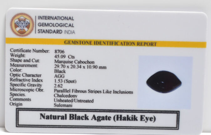 Beautiful 45.09 Cts Natural Black Agate (Hakik Eye) (AAA+-Mines) sva 50+ Ratti SULEMANI HAKIK. Free Horoscope & Free Pundit Ji Astrological Advise / Consultation. Original Natural Lab certified gems by IGI GTL / Birth stones / Large Gem Selection of shree shubh Rashi Ratan Vedic dhan at Gem Mines. May Bhagwan Brahma, Vishnu, Shiv & Universe bless you.
