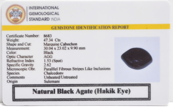 Beautiful 47.34 Cts Natural Black Agate (Hakik Eye) (AAA+-Mines) sva 52+ Ratti SULEMANI HAKIK. Free Horoscope & Free Pundit Ji Astrological Advise / Consultation. Original Natural Lab certified gems by IGI GTL / Birth stones / Large Gem Selection of shree shubh Rashi Ratan Vedic dhan at Gem Mines. May Bhagwan Brahma, Vishnu, Shiv & Universe bless you.