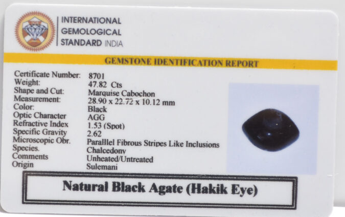 Beautiful 47.82 Cts Natural Black Agate (Hakik Eye) (AAA+-Mines) sva 53+ Ratti SULEMANI HAKIK. Free Horoscope & Free Pundit Ji Astrological Advise / Consultation. Original Natural Lab certified gems by IGI GTL / Birth stones / Large Gem Selection of shree shubh Rashi Ratan Vedic dhan at Gem Mines. May Bhagwan Brahma, Vishnu, Shiv & Universe bless you.