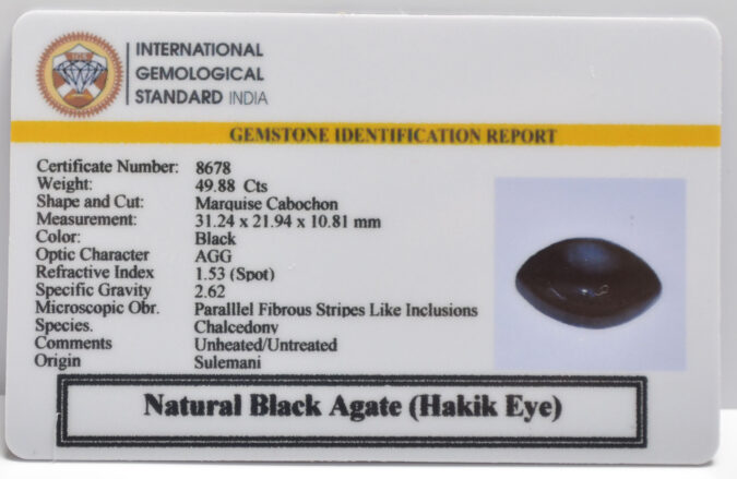 Beautiful 49.88 Cts Natural Black Agate (Hakik Eye) (Top-Mines) sva 55+ Ratti SULEMANI HAKIK. Free Horoscope & Free Pundit Ji Astrological Advise / Consultation. Original Natural Lab certified gems by IGI GTL / Birth stones / Large Gem Selection of shree shubh Rashi Ratan Vedic dhan at Gem Mines. May Bhagwan Brahma, Vishnu, Shiv & Universe bless you.