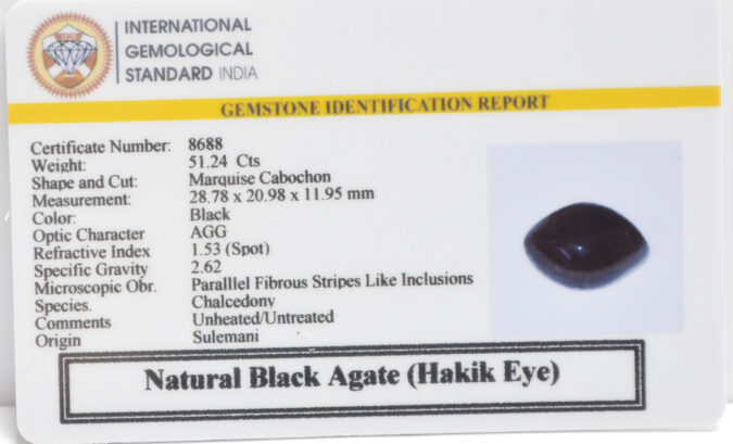 Beautiful 51.24 Cts Natural Black Agate (Hakik Eye) (AAA+-Mines) sva 56+ Ratti SULEMANI HAKIK. Free Horoscope & Free Pundit Ji Astrological Advise / Consultation. Original Natural Lab certified gems by IGI GTL / Birth stones / Large Gem Selection of shree shubh Rashi Ratan Vedic dhan at Gem Mines. May Bhagwan Brahma, Vishnu, Shiv & Universe bless you.