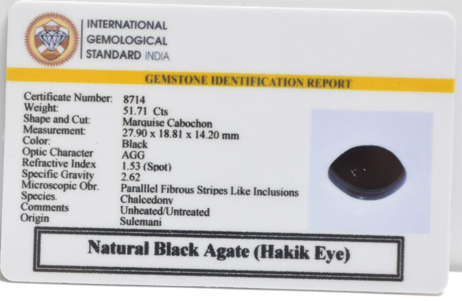 Beautiful 51.71 Cts Natural Black Agate (Hakik Eye) (AAA+-Mines) sva 57+ Ratti SULEMANI HAKIK. Free Horoscope & Free Pundit Ji Astrological Advise / Consultation. Original Natural Lab certified gems by IGI GTL / Birth stones / Large Gem Selection of shree shubh Rashi Ratan Vedic dhan at Gem Mines. May Bhagwan Brahma, Vishnu, Shiv & Universe bless you.