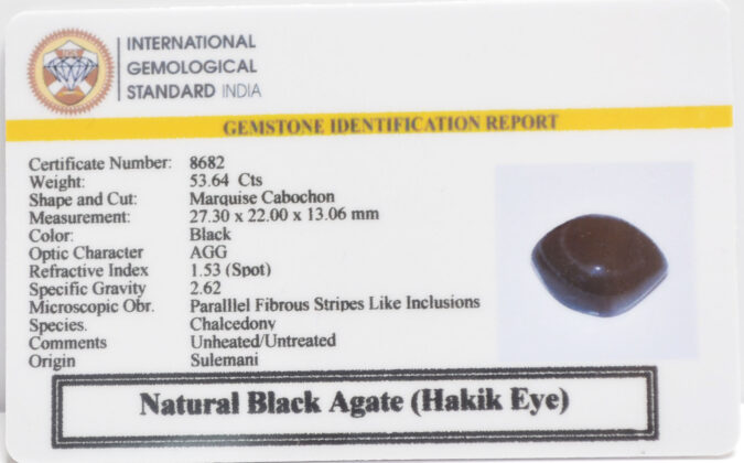 Beautiful 53.64 Cts Natural Black Agate (Hakik Eye) (AAA+-Mines) sva 59+ Ratti SULEMANI HAKIK. Free Horoscope & Free Pundit Ji Astrological Advise / Consultation. Original Natural Lab certified gems by IGI GTL / Birth stones / Large Gem Selection of shree shubh Rashi Ratan Vedic dhan at Gem Mines. May Bhagwan Brahma, Vishnu, Shiv & Universe bless you.