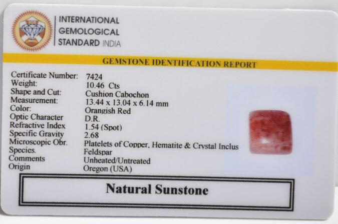 Beautiful 10.46 Cts Natural Sunstone (AAA+-Mines) sva 11+ Ratti SUNSTONE. Free Horoscope & Free Pundit Ji Astrological Advise / Consultation. Original Natural Lab certified gems by IGI GTL / Birth stones / Large Gem Selection of shree shubh Rashi Ratan Vedic dhan at Gem Mines. May Bhagwan Brahma, Vishnu, Shiv & Universe bless you.