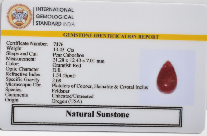 Beautiful 13.45 Cts Natural Sunstone (Top-Mines) sva 14+ Ratti SUNSTONE. Free Horoscope & Free Pundit Ji Astrological Advise / Consultation. Original Natural Lab certified gems by IGI GTL / Birth stones / Large Gem Selection of shree shubh Rashi Ratan Vedic dhan at Gem Mines. May Bhagwan Brahma, Vishnu, Shiv & Universe bless you.