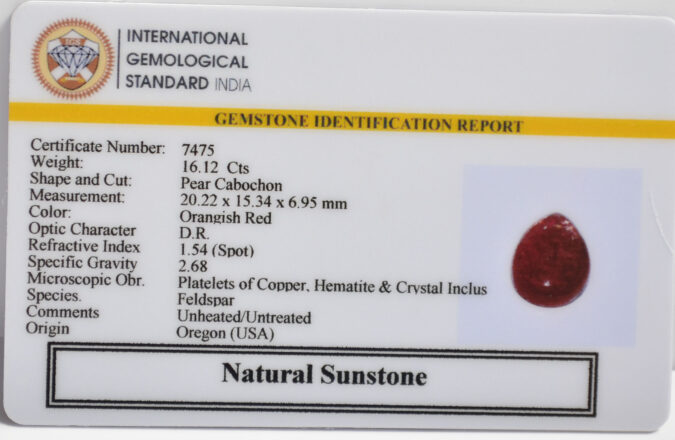 Certified Natural Sunstone 16.12 Ct.(17+ Ratti) in Pear Cabochon shape