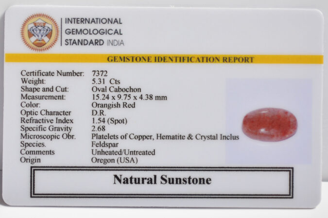 Beautiful 5.31 Cts Natural Sunstone (Top-Mines) sva 5+ Ratti SUNSTONE. Free Horoscope & Free Pundit Ji Astrological Advise / Consultation. Original Natural Lab certified gems by IGI GTL / Birth stones / Large Gem Selection of shree shubh Rashi Ratan Vedic dhan at Gem Mines. May Bhagwan Brahma, Vishnu, Shiv & Universe bless you.
