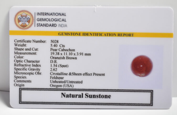 Beautiful 5.4 Cts Natural Sunstone (Top+-Mines) sva 6+ Ratti SUNSTONE. Free Horoscope & Free Pundit Ji Astrological Advise / Consultation. Original Natural Lab certified gems by IGI GTL / Birth stones / Large Gem Selection of shree shubh Rashi Ratan Vedic dhan at Gem Mines. May Bhagwan Brahma, Vishnu, Shiv & Universe bless you.