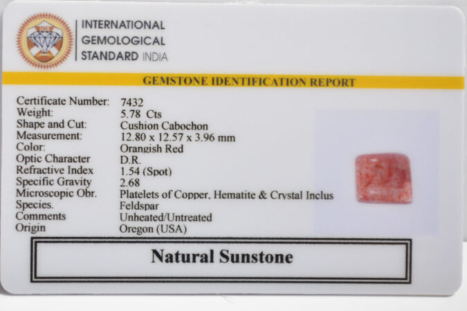 Beautiful 5.78 Cts Natural Sunstone (AAA+-Mines) sva 6+ Ratti SUNSTONE. Free Horoscope & Free Pundit Ji Astrological Advise / Consultation. Original Natural Lab certified gems by IGI GTL / Birth stones / Large Gem Selection of shree shubh Rashi Ratan Vedic dhan at Gem Mines. May Bhagwan Brahma, Vishnu, Shiv & Universe bless you.