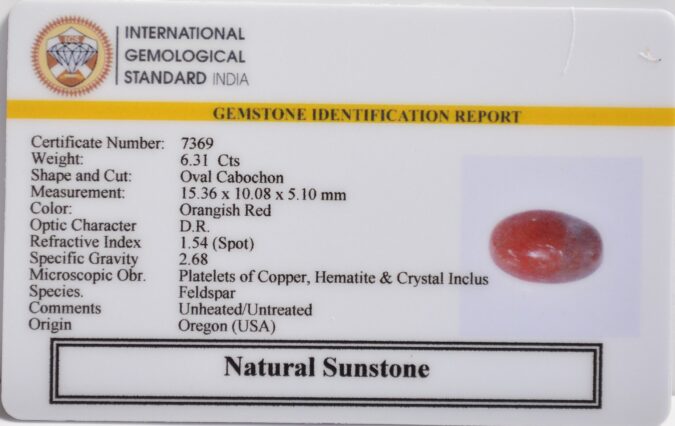 Beautiful 6.31 Cts Natural Sunstone (Top-Mines) sva 7+ Ratti SUNSTONE. Free Horoscope & Free Pundit Ji Astrological Advise / Consultation. Original Natural Lab certified gems by IGI GTL / Birth stones / Large Gem Selection of shree shubh Rashi Ratan Vedic dhan at Gem Mines. May Bhagwan Brahma, Vishnu, Shiv & Universe bless you.