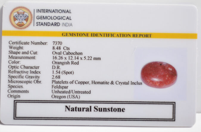 Beautiful 8.48 Cts Natural Sunstone (Top-Mines) sva 9+ Ratti SUNSTONE. Free Horoscope & Free Pundit Ji Astrological Advise / Consultation. Original Natural Lab certified gems by IGI GTL / Birth stones / Large Gem Selection of shree shubh Rashi Ratan Vedic dhan at Gem Mines. May Bhagwan Brahma, Vishnu, Shiv & Universe bless you.