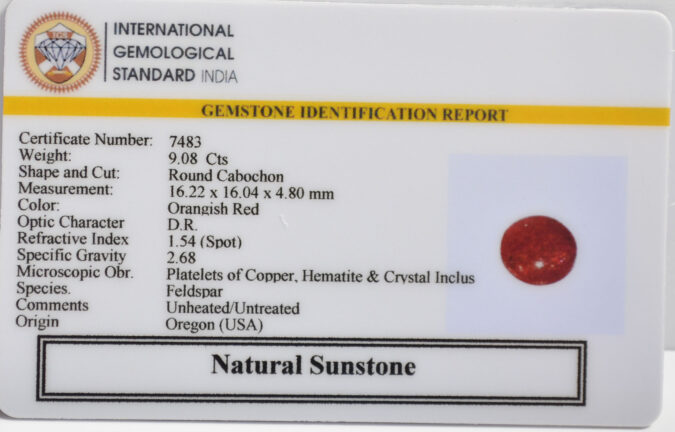 Beautiful 9.08 Cts Natural Sunstone (Top-Mines) sva 10+ Ratti SUNSTONE. Free Horoscope & Free Pundit Ji Astrological Advise / Consultation. Original Natural Lab certified gems by IGI GTL / Birth stones / Large Gem Selection of shree shubh Rashi Ratan Vedic dhan at Gem Mines. May Bhagwan Brahma, Vishnu, Shiv & Universe bless you.