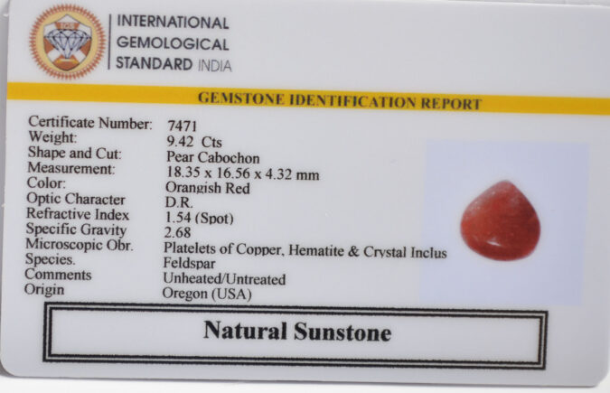 Beautiful 9.42 Cts Natural Sunstone (Top-Mines) sva 10+ Ratti SUNSTONE. Free Horoscope & Free Pundit Ji Astrological Advise / Consultation. Original Natural Lab certified gems by IGI GTL / Birth stones / Large Gem Selection of shree shubh Rashi Ratan Vedic dhan at Gem Mines. May Bhagwan Brahma, Vishnu, Shiv & Universe bless you.