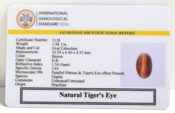 Beautiful 1.98 Cts Natural Tiger’s Eye (AAA+-Mines) sva 2+ Ratti TIGER’S EYE. Free Horoscope & Free Pundit Ji Astrological Advise / Consultation. Original Natural Lab certified gems by IGI GTL / Birth stones / Large Gem Selection of shree shubh Rashi Ratan Vedic dhan at Gem Mines. May Bhagwan Brahma, Vishnu, Shiv & Universe bless you.