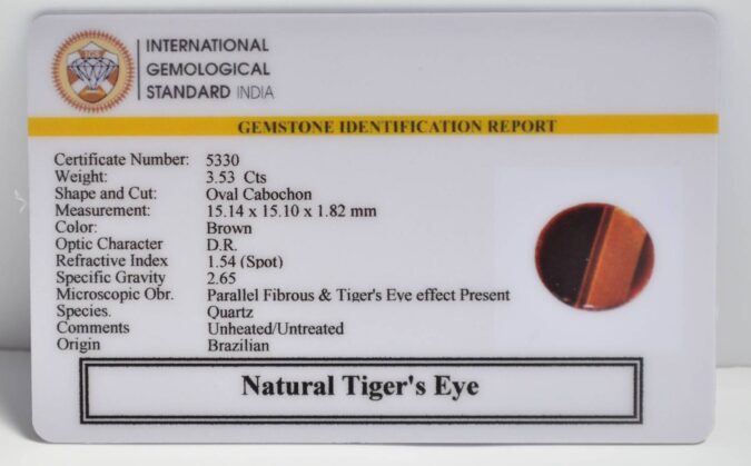 Beautiful 3.53 Cts Natural Tiger’s Eye (AAA-Mines) sva 3+ Ratti TIGER’S EYE. Free Horoscope & Free Pundit Ji Astrological Advise / Consultation. Original Natural Lab certified gems by IGI GTL / Birth stones / Large Gem Selection of shree shubh Rashi Ratan Vedic dhan at Gem Mines. May Bhagwan Brahma, Vishnu, Shiv & Universe bless you.