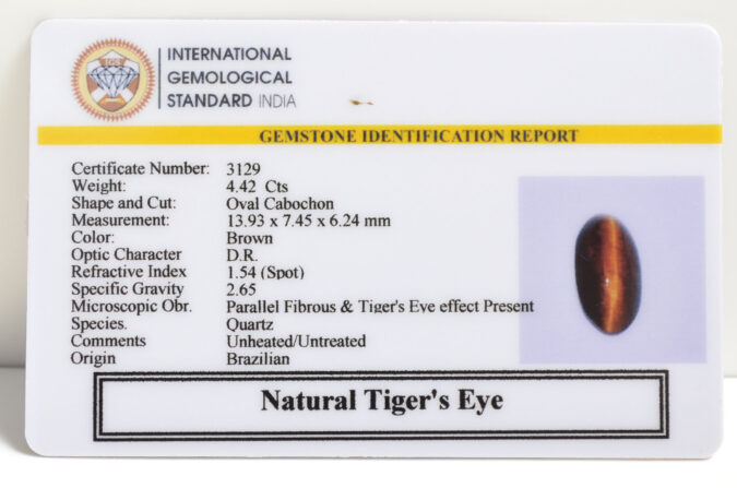 Beautiful 4.42 Cts Natural Tiger’s Eye (AAA+-Mines) sva 4+ Ratti TIGER’S EYE. Free Horoscope & Free Pundit Ji Astrological Advise / Consultation. Original Natural Lab certified gems by IGI GTL / Birth stones / Large Gem Selection of shree shubh Rashi Ratan Vedic dhan at Gem Mines. May Bhagwan Brahma, Vishnu, Shiv & Universe bless you.
