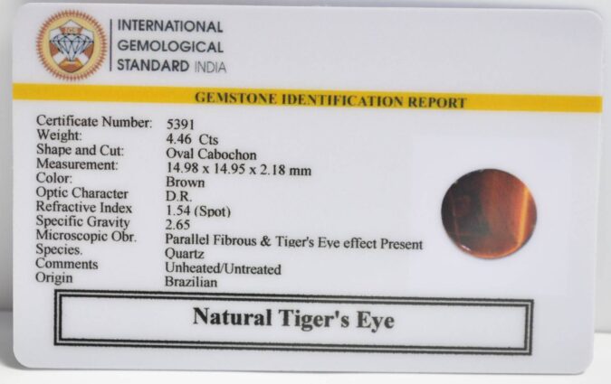 Beautiful 4.46 Cts Natural Tiger’s Eye (AAA-Mines) sva 4+ Ratti TIGER’S EYE. Free Horoscope & Free Pundit Ji Astrological Advise / Consultation. Original Natural Lab certified gems by IGI GTL / Birth stones / Large Gem Selection of shree shubh Rashi Ratan Vedic dhan at Gem Mines. May Bhagwan Brahma, Vishnu, Shiv & Universe bless you.