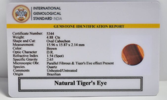 Beautiful 4.88 Cts Natural Tiger’s Eye (Top+-Mines) sva 5+ Ratti TIGER’S EYE. Free Horoscope & Free Pundit Ji Astrological Advise / Consultation. Original Natural Lab certified gems by IGI GTL / Birth stones / Large Gem Selection of shree shubh Rashi Ratan Vedic dhan at Gem Mines. May Bhagwan Brahma, Vishnu, Shiv & Universe bless you.