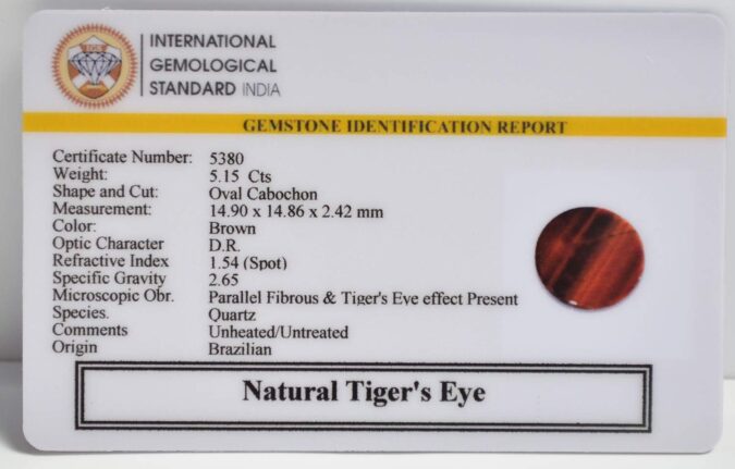 Beautiful 5.15 Cts Natural Tiger’s Eye (AAA-Mines) sva 5+ Ratti TIGER’S EYE. Free Horoscope & Free Pundit Ji Astrological Advise / Consultation. Original Natural Lab certified gems by IGI GTL / Birth stones / Large Gem Selection of shree shubh Rashi Ratan Vedic dhan at Gem Mines. May Bhagwan Brahma, Vishnu, Shiv & Universe bless you.
