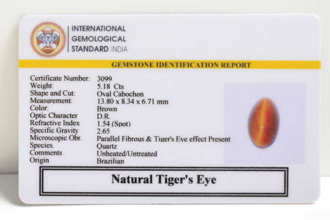 Beautiful 5.18 Cts Natural Tiger’s Eye (AAA+-Mines) sva 5+ Ratti TIGER’S EYE. Free Horoscope & Free Pundit Ji Astrological Advise / Consultation. Original Natural Lab certified gems by IGI GTL / Birth stones / Large Gem Selection of shree shubh Rashi Ratan Vedic dhan at Gem Mines. May Bhagwan Brahma, Vishnu, Shiv & Universe bless you.