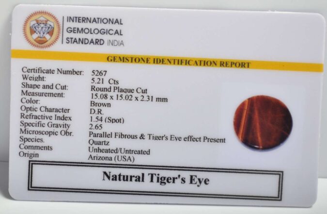 Beautiful 5.21 Cts Natural Tiger’s Eye (Good-Mines) sva 5+ Ratti TIGER’S EYE. Free Horoscope & Free Pundit Ji Astrological Advise / Consultation. Original Natural Lab certified gems by IGI GTL / Birth stones / Large Gem Selection of Shree Shubh Rashi Ratan Vedic Dhan at Gem Mines. May Bhagwan Brahma, Vishnu, Shiv & Universe bless you. This tiger eye stone is admired for its radiant golden-brown hues and its powerful energy-balancing properties. The tiger eye stone benefit includes enhancing mental clarity, boosting focus, improving self-confidence, attracting positive vibrations, and providing protection against negativity. Wearing this authentic Tiger’s Eye gemstone adds elegance, spiritual strength, emotional balance, and a sense of inner harmony, making it a treasured and meaningful addition to any gemstone .