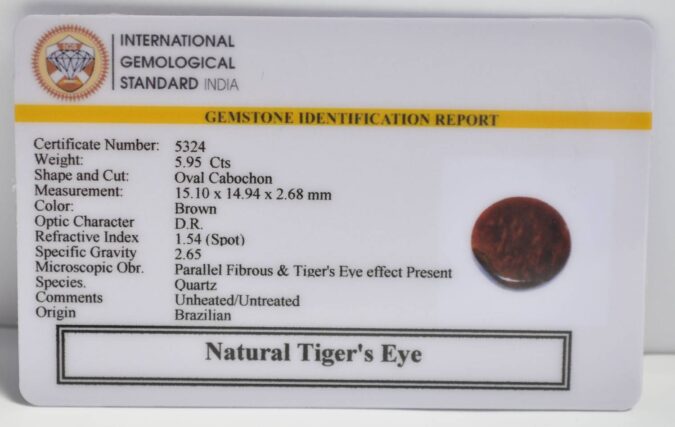Beautiful 5.95 Cts Natural Tiger’s Eye (Very Good-Mines) sva 6+ Ratti TIGER’S EYE. Free Horoscope & Free Pundit Ji Astrological Advise / Consultation. Original Natural Lab certified gems by IGI GTL / Birth stones / Large Gem Selection of shree shubh Rashi Ratan Vedic dhan at Gem Mines. May Bhagwan Brahma, Vishnu, Shiv & Universe bless you.