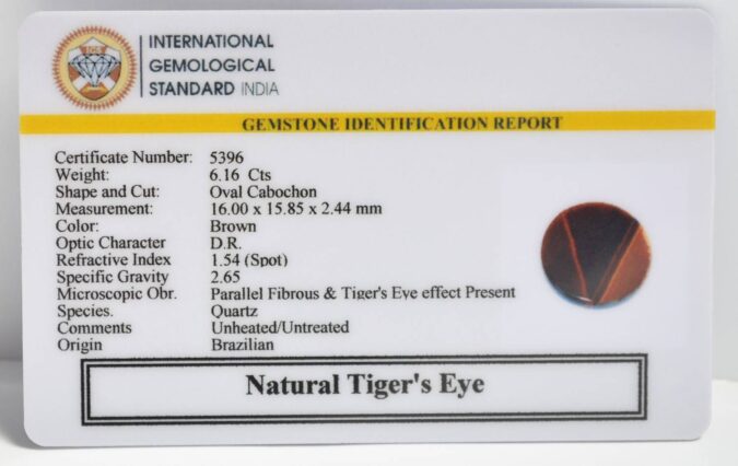 Beautiful 6.16 Cts Natural Tiger’s Eye (Very Good-Mines) sva 6+ Ratti TIGER’S EYE. Free Horoscope & Free Pundit Ji Astrological Advise / Consultation. Original Natural Lab certified gems by IGI GTL / Birth stones / Large Gem Selection of shree shubh Rashi Ratan Vedic dhan at Gem Mines. May Bhagwan Brahma, Vishnu, Shiv & Universe bless you.