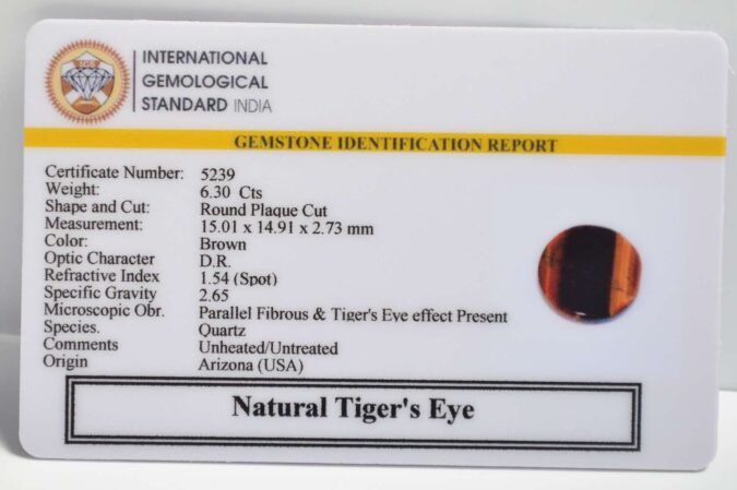 Beautiful 6.3 Cts Natural Tiger’s Eye (Good-Mines) sva 7+ Ratti TIGER’S EYE. Free Horoscope & Free Pundit Ji Astrological Advise / Consultation. Original Natural Lab certified gems by IGI GTL / Birth stones / Large Gem Selection of Shree Shubh Rashi Ratan Vedic Dhan at Gem Mines. May Bhagwan Brahma, Vishnu, Shiv & Universe bless you. This tiger eye stone is admired for its striking golden-brown shimmer as well as its powerful metaphysical properties. The tiger eye stone benefit includes improving focus, enhancing confidence, providing mental clarity, attracting positive energies, and offering protection against negative influences. Owning and wearing this genuine Tiger’s Eye gemstone allows you to enjoy elegance, spiritual strength, and divine blessings, making it a meaningful and valuable addition to any gemstone .